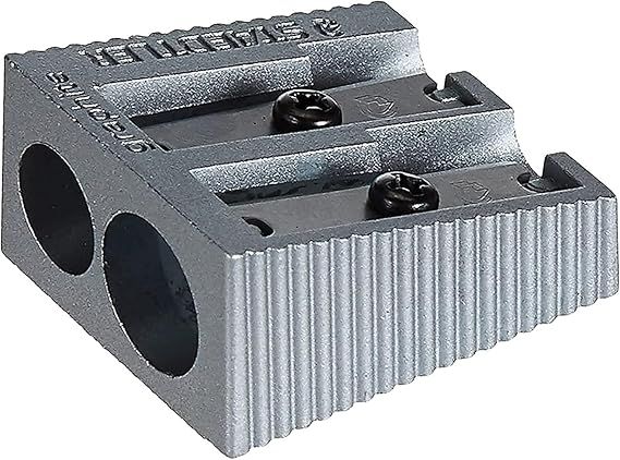 Sacapuntas de metal Staedtler para lapiceros de grafito de tamaño estándar de hasta 8,2 y 10,2 mm de diámetro. Forma de cuña. Doble agujero. Cajas de 20 unidades.