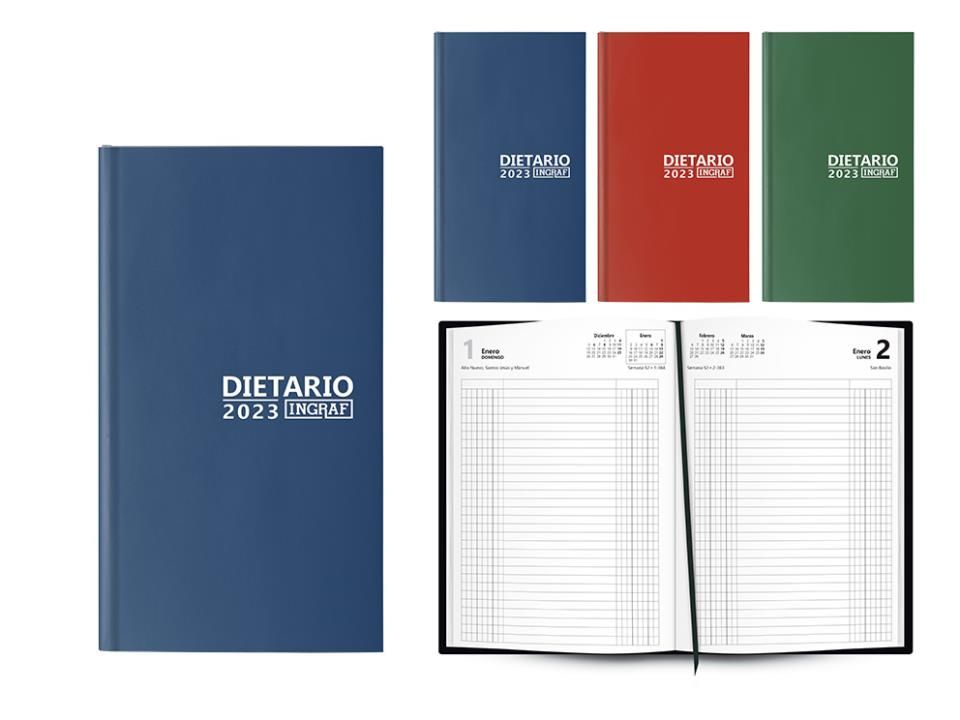 DIETARIO tamaño 8º Año 2023. DIA PÁGINA, INCLUSO SÁBADO Y DOMINGO. Rayado con columna a los lados de cada hoja, para llevar al día todas las cuentas. Encuadernación en geltex de primera calidad con estampación en color oro y negro. Con cinta de registro.. Cubiertas en tres colores diferentes. Tamaño hoja: 11,5 x 16,5 cm.