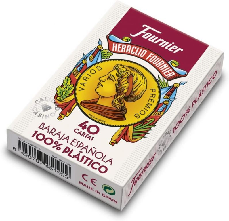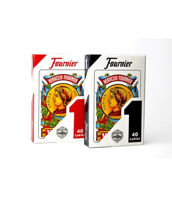 Baraja de naipes españoles de la más alta calidad compuesta por 40 cartas del 1 al 7 más Sota, Caballo y Rey, en sus 4 palos: Oros, Copas, Espadas y Bastos. El reverso puede ser de color azul o rojo. Se sirve en una cajita de cartón individual y retractilada. Envase de 12 unidades.