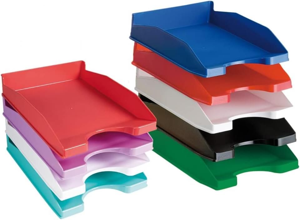 Bandejas de plástico apilables Faibo. Surtido de colores sólidos. Un toque de color para la oficina moderna o la clase del colegio. Medidas :ancho: 250mm, fondo: 350mm. altura: 60mm