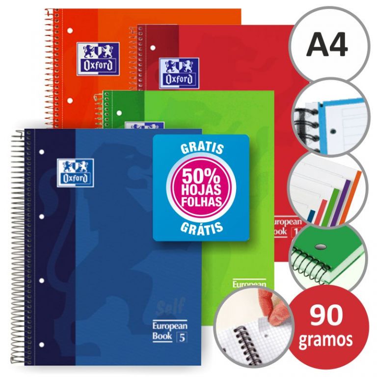 BLOC MICRO OXFORD TE. 50% GRATIS VIVOS. Libreta microperforada Tapa Extradura DIN A4 120 hojas. 50% de hojas gratis. Papel de 90 grm. Envase de 5 libretas en colores surtidos.