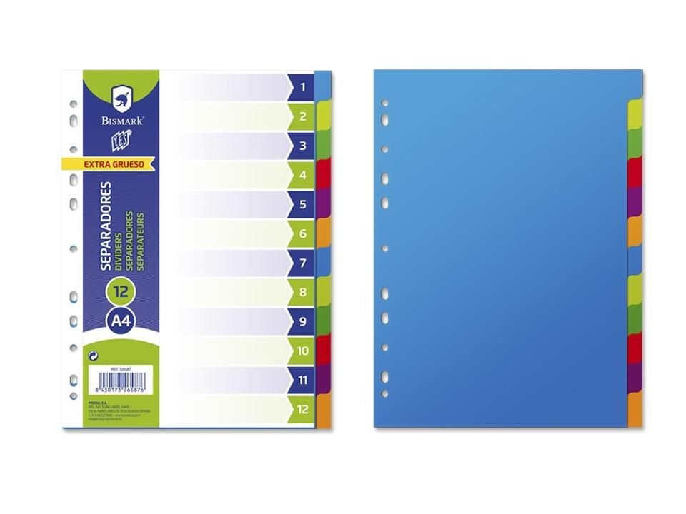 12 pestañas neutras y personalizables permiten identificar rápida y fácilmente el contenido de los separadoresResistencia: los separadores están compuestos de polipropileno, proporcionando una resistencia máxima. Son rígidos y resistentes a los desgarros, ideales para el uso diario.Formato A4. MULTITALADRO.