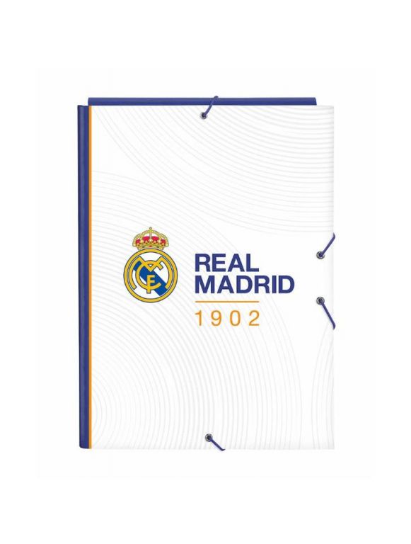 CARPETA FOLIO 3 SOLAPAS REAL MADRID 1ª EQUIP. Tapas duras forradas. Tamaño folio. Cierre con gomas elásticas. Con 3 solapas interiores. MEDIDAS :260x25x335 mm.