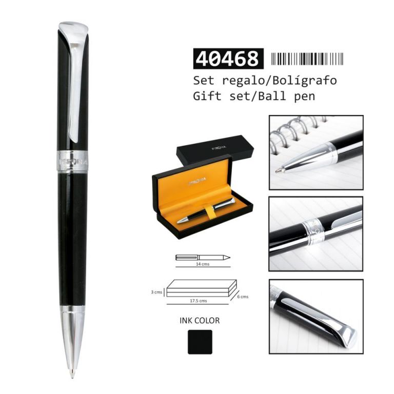 BOLIGRAFO PÈRONABolígrafo presentado en un lujoso estuche rígido con el interior forrado en tela, medidas : 16,5 x 6 x 3 cm. Modelo clásico Con elegante clip cromado, Capuchón lacado negro liso y cuerpo también lacado en color negro liso.