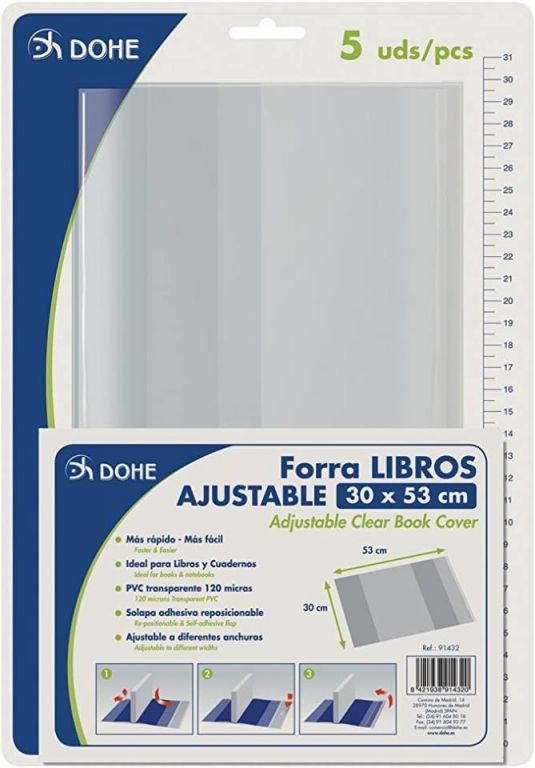 Cubiertas protectoras de libros y cuadernos. Lomo de 28 cm.Fabricadas en PVC de 120 micrasCon solapa adhesiva reposicionable. PACK DE 5 UNIDADES.