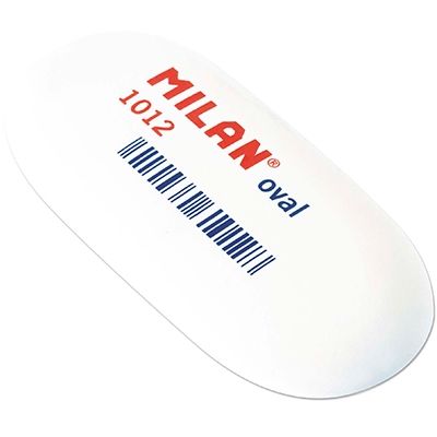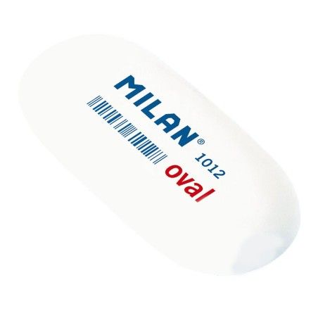 Goma de borrar de forma ovalada Milan 1012 de caucho sintético, blanda y suave. Ideal para borrar lápices de grafito de una amplia gama y sobre toda clase de papeles, perfecta para uso escolar. Sus medidas son 6,3 x 3,3 x 1,3 cm. Envase de 12 gomas.