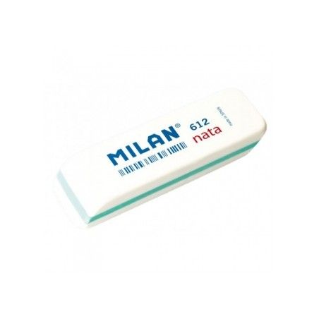 Goma "Nata" de plástico blanca, suave, versátil y no abrasiva. Para borrar sobre todo tipo de superficies. No daña el papel. Goma biselada blanca con un ribete de colores aleatorios: azul, rojo, verde. Medidas goma: 7,8 x 2,3 x 1,2 cm. Envase de 12 gomas.