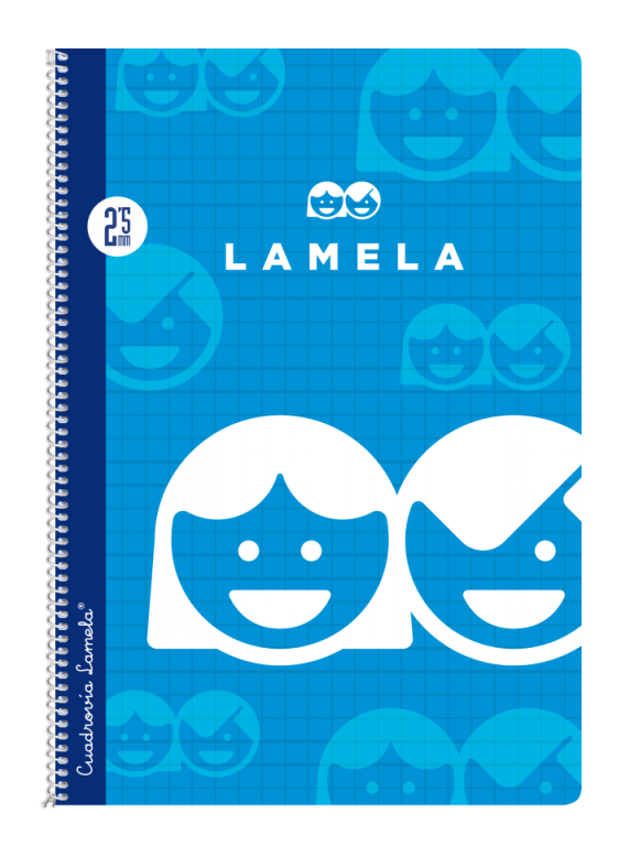 Cuadernos espiral cubierta básicaCartón plastificado impreso en 8 colores surtidos.Espiral lacado blanco.Offset blanco extra de 70 g/m con margen. Rayados con Cuadrovía Lamela® en tamaño de 2,5 mm.80 hojas.Colores:Lila, azul oscuro, azul claro, naranja, rojo, verde claro, verde oscuro y rosa.Los cuadernos Cuadrovía Lamela® en tamaño Folio de cubierta básica se presentan en paquetes de 10 unidades, con 8 colores surtidos.Unidad mínima de venta 1 paquete (10 unidades).