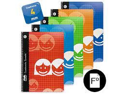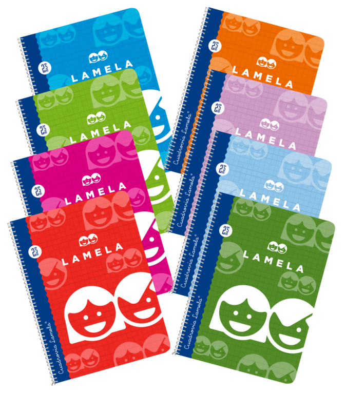 Cuadernos espiral cubierta básicaCartón plastificado impreso en 8 colores surtidos.Espiral lacado blanco.Offset blanco extra de 70 g/m con margen. Rayados con Cuadrovía Lamela® en tamaño de 4 mm.80 hojas.Colores:Lila, azul oscuro, azul claro, naranja, rojo, verde claro, verde oscuro y rosa.Los cuadernos Cuadrovía Lamela® en tamaño Folio de cubierta básica se presentan en paquetes de 10 unidades, con 8 colores surtidos.Unidad mínima de venta 1 paquete (10 unidades).