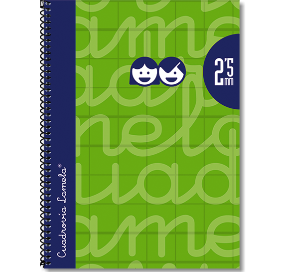 Cubierta:Cartón forrado con papel impreso a color y plastificado.Espiral sencillo con lazo vuelto, lacado negro.Papel y rayado:Offset blanco extra de 70 g/m con margen. Rayados con Cuadrovía Lamela® en tamaños de 2,5 mm.80 hojas. Los cuadernos de Cuadrovía Lamela® cubierta extra dura forrada de tamaño cuarto se presentan en paquetes de 5 unidades.