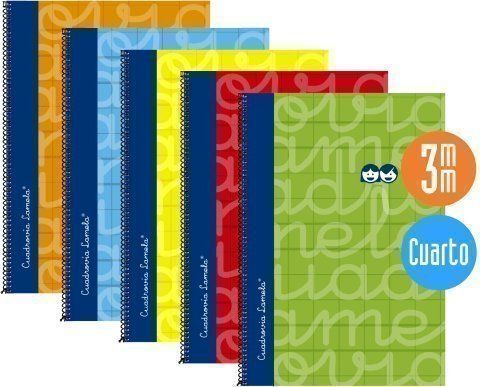 Cubierta:Cartón forrado con papel impreso a color y plastificado.Espiral sencillo con lazo vuelto, lacado negro.Papel y rayado:Offset blanco extra de 70 g/m con margen. Rayados con Cuadrovía Lamela® en tamaño de 3 mm.80 hojas. Los cuadernos de Cuadrovía Lamela® cubierta extra dura forrada de tamaño cuarto se presentan en paquetes de 5 unidades colores surtidos.