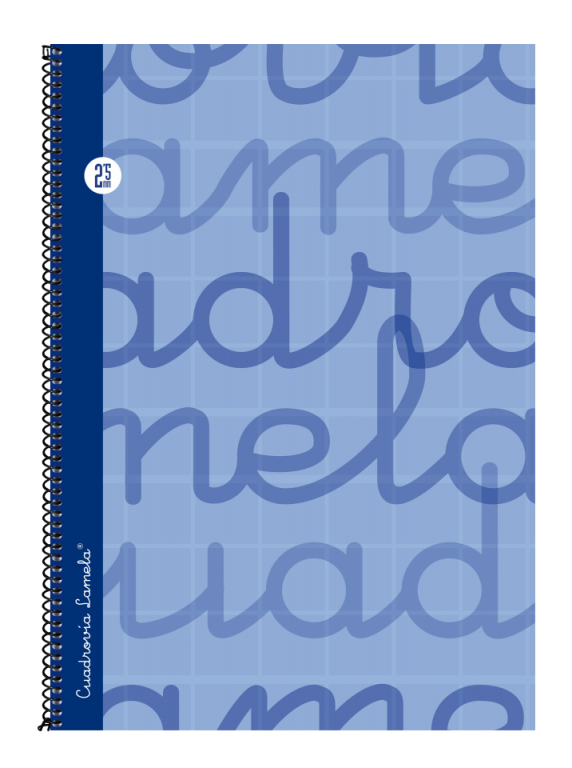 Cubierta:Cartón forrado con papel impreso a color y plastificado.Espiral sencillo con lazo vuelto, lacado negro.Papel y rayado:Offset blanco extra de 70 g/m con margen. Rayados con Cuadrovía Lamela® en tamaño 2,5 mm.80hojas.Los cuadernos de Cuadrovía Lamela® con cubierta extradura forrada de tamaño folio se presentan en paquetes de 5 unidades, cajas de 25.