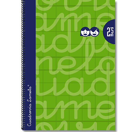 Cubierta:Cartón forrado con papel impreso a color y plastificado.Espiral sencillo con lazo vuelto, lacado negro.Papel y rayado:Offset blanco extra de 70 g/m con margen. Rayados con Cuadrovía Lamela® en tamaño 2,5 mm.80hojas.Los cuadernos de Cuadrovía Lamela® con cubierta extradura forrada de tamaño folio se presentan en paquetes de 5 unidades, cajas de 25.
