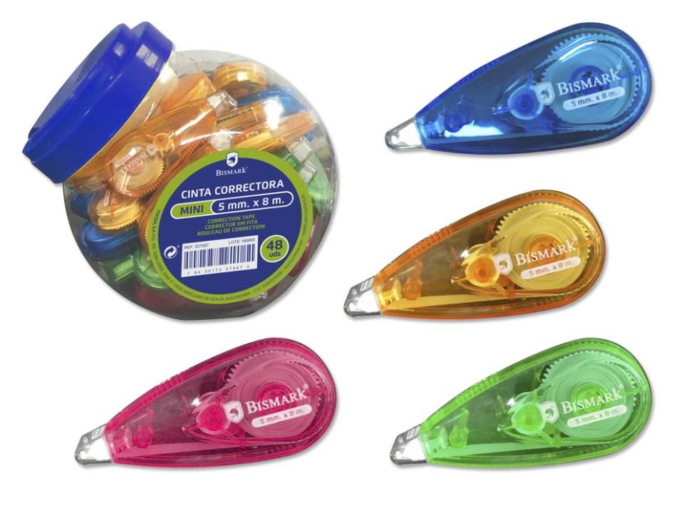 Cinta correctora en seco de alta calidad.Corrige sobre cualquier tipo de papel de forma rápida.Permite la escritura inmediata con bolígrafo, roller, pluma, etc.Ancho de la cinta: 5 mm.Largo: 8 metros.Bombona con 48 unidades.