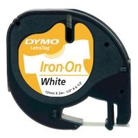 Cinta Dymo 18769 Original para etiquetadoras LetraTag. Cinta de tejido Termoadhesivo negro sobre blanco. Está especialmente diseñada para planchar ropa y telas, y es lavable. Esta cinta tiene un ancho de 12 mm y 2 metros de largo.