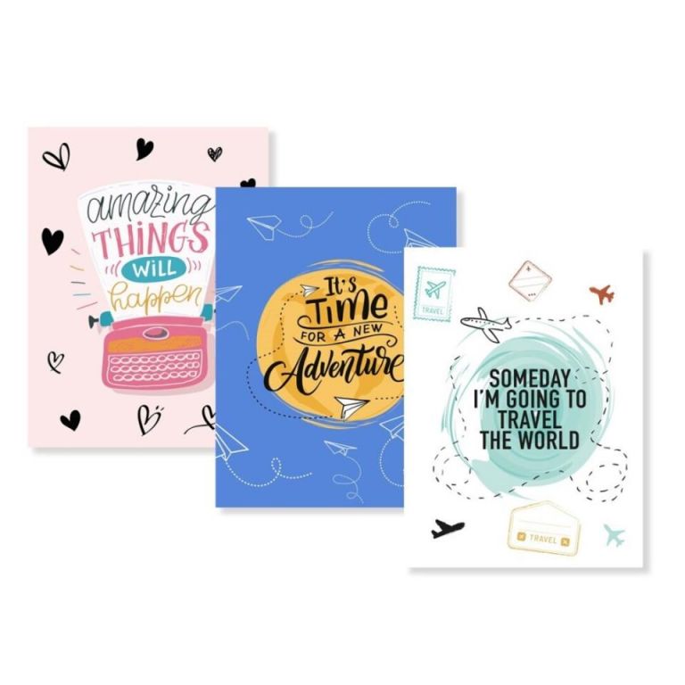 Album decorado con 25 hojas adhesivas para viajes y recuerdos, tres modelos distintos.
