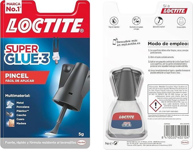Pegamento Super Glue Frasco líquido con pincel. Ultrafuerte. 5gr. Pega definitivamente en 10 segundos sobre cualquier soporte.El Super Glue-3 de Loctite es un adhesivo monocomponente a base de cianoacrilato y de viscosidad media. Envase antichoque, cierre de seguridad. Uso multimateriales.