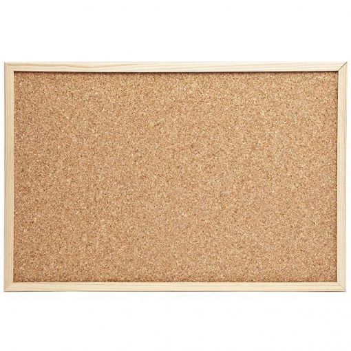 Pizarra de corcho con marco de madera. Ideal para utilizar como tablón de anuncios. Contiene escarpia para colgar en pared.