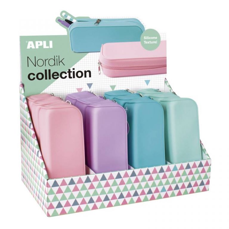 Estuches de silicona modelo Nordik collection. Silicona de alta calidad con acabado tacto suave. Cada expositor contiene 12 estuches tamaño 185 x 75 x 55 mm en 4 colores surtidos: rosa, violeta, azul y verde. Estuches con cremallera, flexibles y moldeables. Resistentes al agua y muy fáciles de limpiar.
