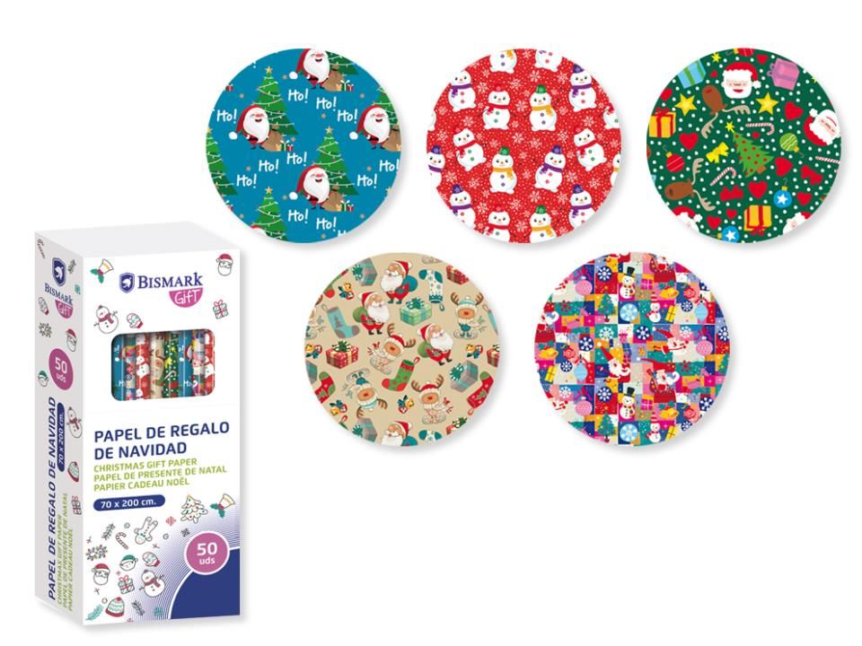 Rollos de PAPEL REGALO. Medidas: 2 mt X 70cm . Motivos decorados NAVIDEÑOS. Envase de 50 rollos.