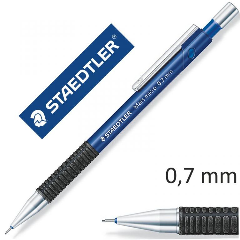 Portaminas técnico Staedtler Mars micro para escribir o dibujar. Punta retráctil manual. Mina amortiguada conforme normativa ISO. Zona de agarre antideslizante, engomada. Punta cilíndrica rígida, adecuada para reglas y plantillas. Goma de borrar con capuchón. Tamaño: 147x8x10 mm