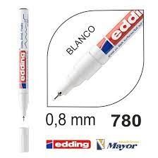 Rotulador edding punta fibra 780 BLANCO punta FINA DE 0.8 mmMarcador de tinta opaca con punta redonda.Para marcar sobre casi todo tipo de superficies como madera, vidrio, plástico y metal.Tinta permanente cubriente con efecto lacado casi sin olor especialmente apta para escribir sobre materiales transparentes y oscuros.Tinta de secado rápido resistente al agua y a la acción de la luz, al roce y al calor: color blanco y plata visibles hasta 1.000º C y oro hasta 400º C.Se activa mediante sistema de bombeo.Cuerpo de aluminio.