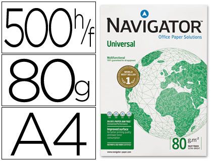 PAPEL Navigator Universal. Papel multiusos para impresora. Gramaje de 80+/- 3 g/m² y espesor de 108 +/- 3 micras. Libre de atascos: el papel Navigator asegura un inmejorable 99.99% sin atascos. Normas: ISO 536, ISO 11475, ISO 2471, ISO 534, ISO 8791-2. Reduce el efecto abrasivo y protege la impresora.Hojas por paquete: 500. Formato: A4. Envase de 5 paquetes.